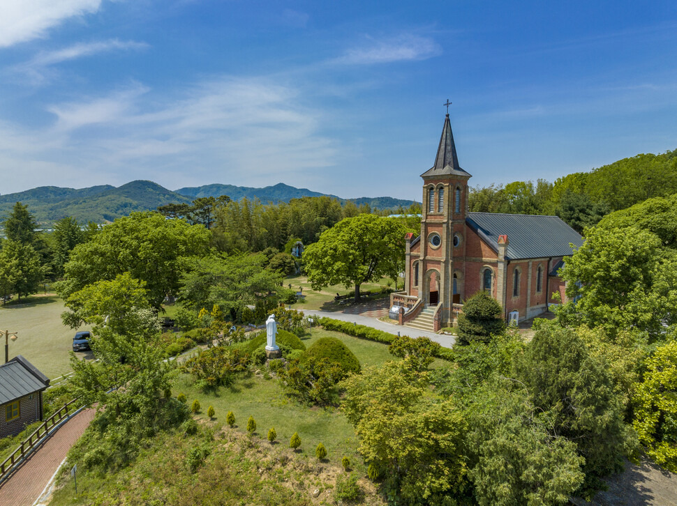 1895년 작은 기와집에서 시작된 이 성당은 1923년 푸아넬 신부의 설계로 재건되었으며, 한국전쟁 중 야전병원으로 쓰이기도 했습니다. 신로마네스크 양식의 건축물로 종탑과 붉은 벽돌 외관이 인상적입니다.