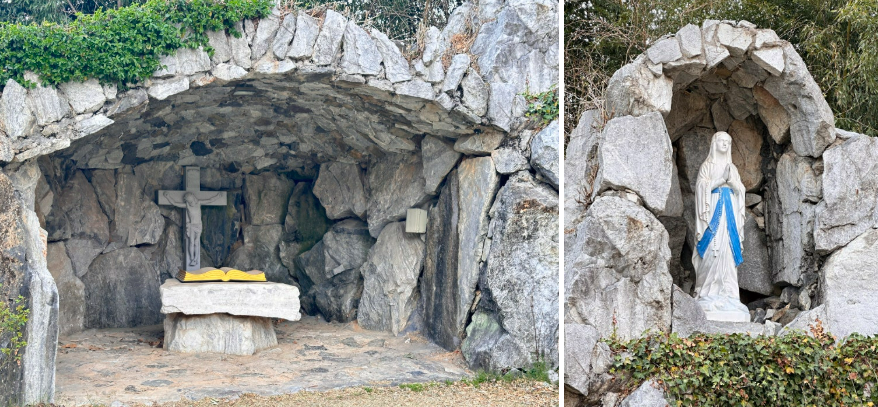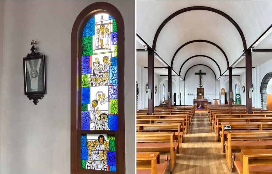 정문 앞 성가족 동상, 옆쪽의 잔디광장과 기도굴, 배롱나무 정원 등 사진 찍기 좋은 포인트가 곳곳에 있습니다. 내부도 관람 가능하며, 스테인드글라스의 은은한 채광은 힐링 그 자체입니다.