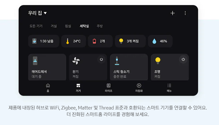 빅스비 음성 제어, 3D 맵뷰를 통한 가전 제어, SmartThings와의 연동으로 스마트홈 경험을 완성합니다.