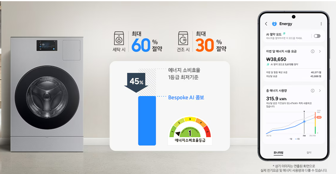 AI 절약 모드로 세탁 시 최대 60%, 건조 시 최대 30%의 에너지를 절감할 수 있습니다.